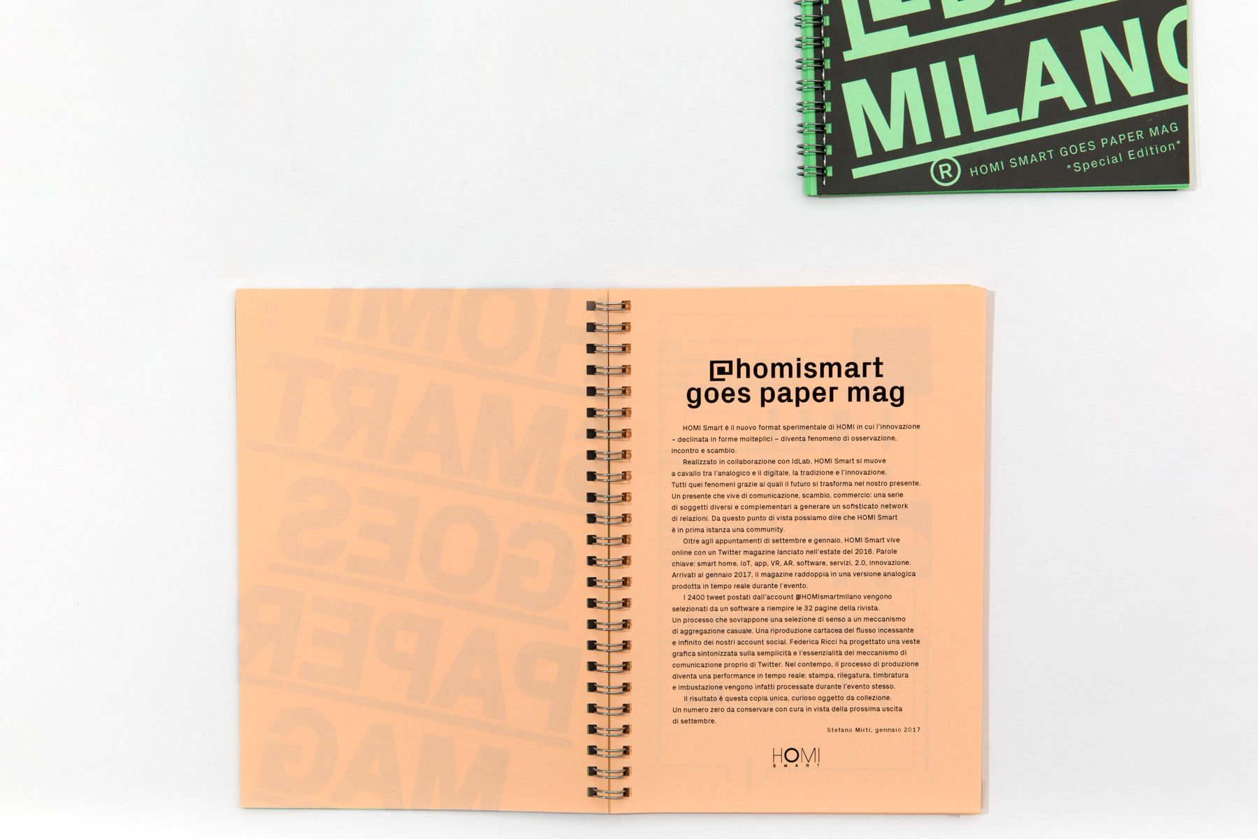 For HOMI 2017, I worked on building a bridge between the digital and the analog community and created Homismart Goes Paper Mag, a collection of 2400 tweets selected from its account and participating communities. Through few lines of code, the user-generated content went through a built-in layout and got printed automatically while the human intervention consisted in binding, live, the pages into the form of a magazine.